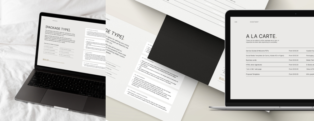In this template you will be able to provide insight on your clients goals, your unique approach, and how you plan to bring to life their vision in a phased or packaged approach. The copy prompts and service option pages allow you to customise the proposal to suit your clients but also the way you work as a creative. It helps you lay the foundation for a strong working relationship and positions you as an expert.